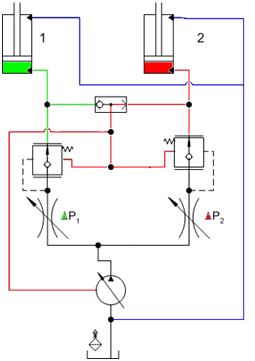 然后柱塞泵根據(jù)得到的信息作出調(diào)整,僅提供系統(tǒng)所需的流量和壓力,這種系統(tǒng)也叫負(fù)載敏感系統(tǒng),系統(tǒng)可以根據(jù)實(shí)際工況所需的流量和壓力不同。