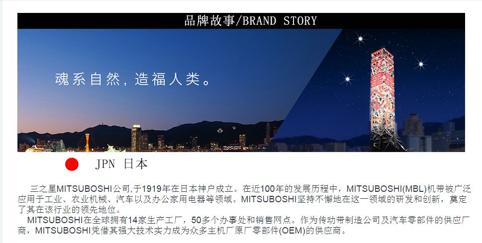 1919年,在日本神戶,三之星作為工業(yè)皮帶的專業(yè)制造商正式成立。百年的風雨兼程,雖歷盡滄桑,但仍充滿朝氣;百年的斗轉星移,雖千變萬化,但仍初心不改。 百年前的破殼 讓三之星從無到有 百年間的創(chuàng)造 讓三之星如日中天 沾百年之福,成無憂生產 在100年的發(fā)展歷程中,MITSUBOSHI堅持不懈地在這一領域的研發(fā)和創(chuàng)新,奠定了其在該行業(yè)的領先地位。為適應未來世界的需求,更加積極向更高技術挑戰(zhàn),為滿足人們的生活、豐富社會提供新產品。 三星皮帶為滿足各種苛刻的汽車開動條件而設計開發(fā)的高品質傳動帶,具有壽命長,無需維修的特點。利用新生產工藝,在一定程度上能夠很好的減少噪音,增強耐磨性,提高耐久性。并能減輕車輛承受的負荷,以此達到省油的效果。 三之星皮帶產品多樣,可用范圍廣,產品包含:一般產業(yè)用機帶、辦公家用電器用機帶、農業(yè)機械用機帶、汽車用機帶,廣泛應用于工業(yè)、農業(yè)機械、汽車以及辦公家用電器等領域,質量有保證,使用更安心,讓用戶無后顧之憂。