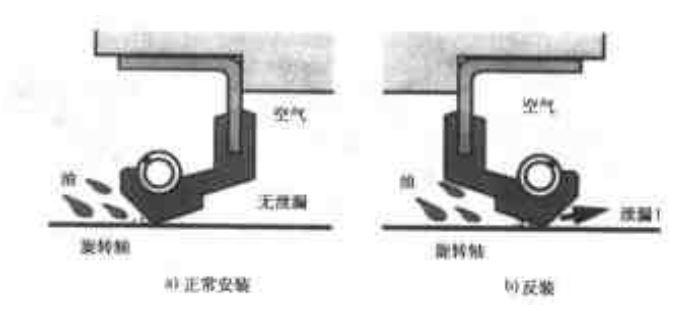 當(dāng)正向安裝時,滿足密封側(cè)坡度較陡,泵送作用可以實現(xiàn)密封;反向安裝不滿足,靜止式不泄露,運轉(zhuǎn)時泄漏。