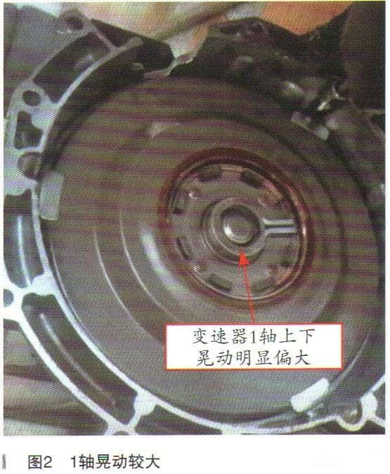 按照一般的診斷,油封很少會出現(xiàn)老化漏油的情況,漏油一般是由于密封元件徑向跳動過大,內(nèi)部氣壓或油壓過高或過低造成的油封唇口變形所導致。上下晃動變速器輸入軸,發(fā)現(xiàn)1軸晃動量比較大,如圖2所示。