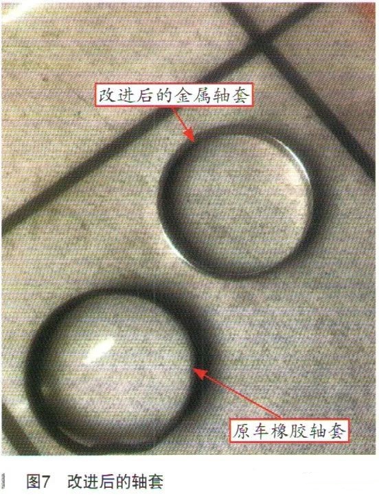 從改進的軸套可以看出,金屬軸套可以牢牢把1軸固定,不像橡膠軸套,易造成1軸跳動,如圖7所示。