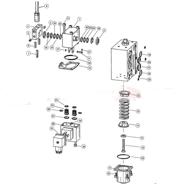 1. 將螺栓11卸下,再卸下2個(gè)彈性擋圈37,取下銷軸9,將多路閥手柄座拿下;