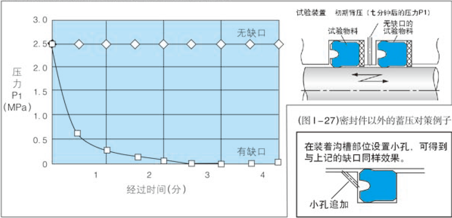 為此,NOK公司針對(duì)性的通過大數(shù)據(jù)實(shí)驗(yàn),來(lái)對(duì)比了有無(wú)缺口的所影響背壓泄露性能的差別。(NOK2010版密封件選型書P231)