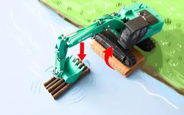 雙側(cè)陷落時:雙側(cè)履帶陷落且不能移動時,在履帶板下鋪設(shè)木料或者圓木,然后將挖斗插入前方圖層中,按照與挖掘相同的要領(lǐng)彎曲小臂,再將行走操作桿置于前進側(cè),將機身拉出。