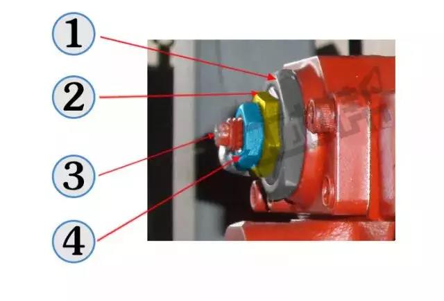調(diào)整步驟:①用開口扳手松開4(藍(lán)色);② 用開口扳手向里(憋車時向外)微調(diào)3(紅色,每次按15度左右)調(diào)節(jié)至正常;③擰緊鎖緊螺母4(藍(lán)色)。