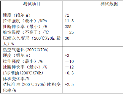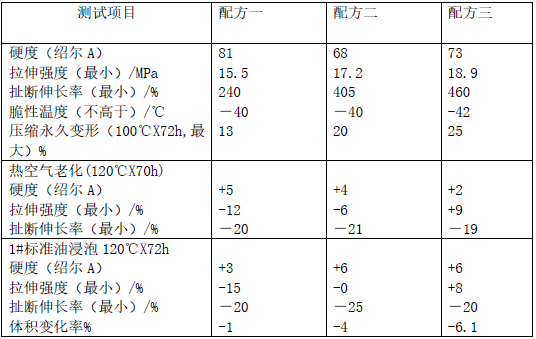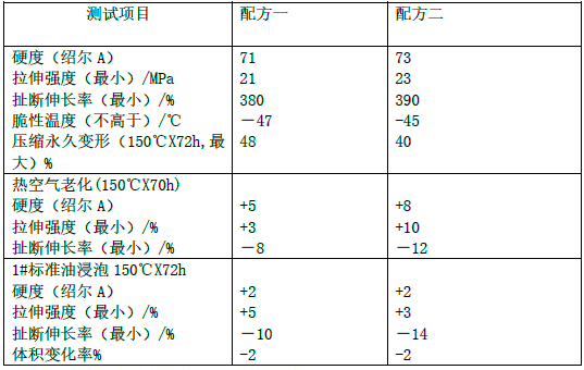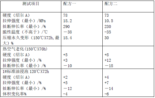 配方二: :氫化丁腈 100;氧化鋅 5;氧化鎂 10;硬脂酸 1;DCP 4;DM 1.5;TAIC 2.5;防老劑ODA 1.5;石蠟 1;N330 50。