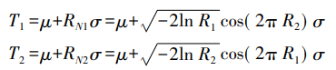 相對應(yīng)的正態(tài)分布N(μ,σ)上的隨機數(shù)T1、T2為: